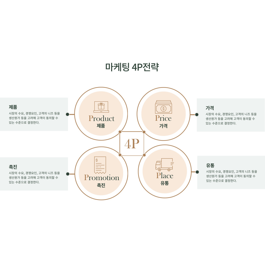 제품(Product)은 기업이 고객들에게 제공하는 상품이나 서비스를 의미합니다. 제품은 고객들의 니즈와 요구를 충족시키는데 초점을 맞추어 개발되어야 합니다. 제품의 특징, 품질, 기능, 디자인 등이 고려되며, 고객들의 니즈와 시장 동향을 분석하여 제품을 개발하고 관리하는 것이 중요합니다. 가격(Price)은 제품이나 서비스의 가치를 반영하는 요소입니다. 가격은 기업의 수익을 결정하고, 고객들의 구매 결정에 영향을 미치는 중요한 요소입니다. 가격 정책은 수익 목표, 경쟁 환경, 제품의 가치, 고객들의 지불 능력 등을 고려하여 수립되어야 합니다. 가격 전략은 기업의 수익과 고객들의 만족도를 균형 있게 유지하면서 경쟁력을 강화하는데 중요한 역할을 합니다. 판매처(Place)는 제품이나 서비스를 고객들에게 제공하는 장소나 유통 경로를 의미합니다. 판매처는 제품의 가용성과 접근성을 보장하는 역할을 합니다. 적절한 유통 채널과 매장 위치, 온라인 플랫폼 등을 선택하여 고객들이 원하는 제품을 편리하게 구매할 수 있도록 지원해야 합니다. 또한, 재고 관리와 물류 체계를 효율적으로 운영하여 고객들에게 신속한 서비스를 제공하는 것이 중요합니다. 홍보(Promotion)는 제품이나 서비스를 대중에게 알리고, 고객들의 인식과 관심을 유도하는 활동입니다. 홍보 전략은 광고, 판촉활동, PR, 디지털 마케팅 등 다양한 수단을 활용하여 제품의 가치와 장점을 강조하며 고객들에게 전달합니다. 고객들의 니즈와 특성을 고려하여 적절한 홍보 채널과 메시지를 선택하고, 고객들과의 상호작용을 통해 브랜드 인식과 고객 충성도를 강화하는데 주력해야 합니다. 4P 모델은 제품, 가격, 판매처, 홍보의 네 가지 요소를 종합적으로 고려하여 마케팅 전략과 실행 계획을 수립하는 데 활용됩니다. 제품의 개발과 관리, 가격 정책, 유통 및 판매 전략, 홍보 및 광고 전략을 적절하게 조합하여 고객들에게 가치를 전달하고 기업의 경쟁력을 향상시킬 수 있습니다. 4P 모델을 적용할 때에는 고객들의 니즈와 시장 동향을 고려하여 맞춤형 전략을 수립하고, 요소들 간의 조화를 이루어야 합니다. 이를 통해 기업은 고객들에게 가치를 제공하고, 성공적인 마케팅을 실현할 수 있습니다.